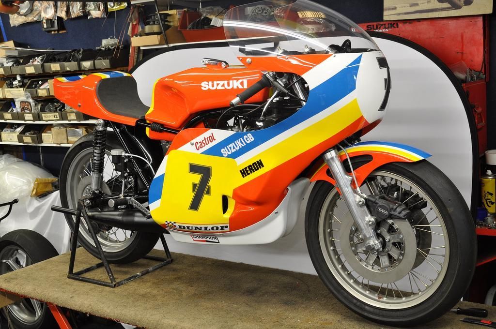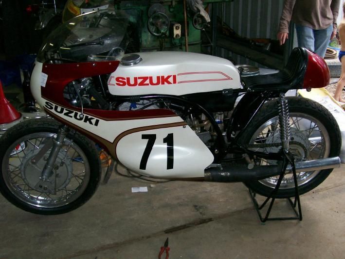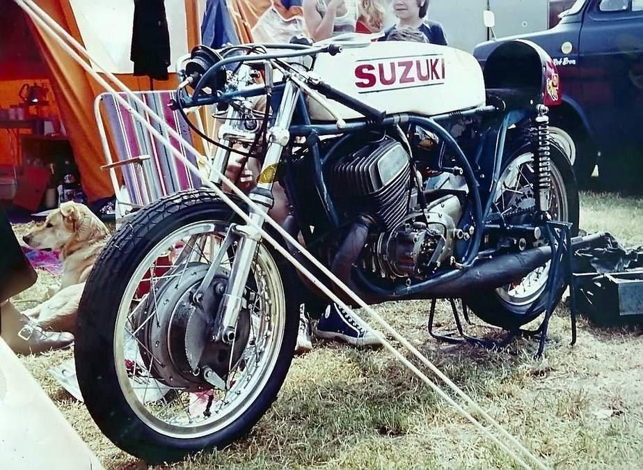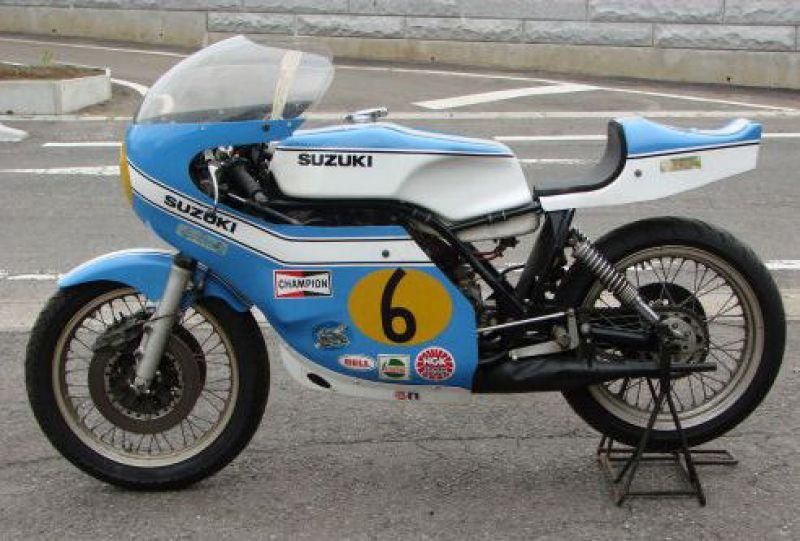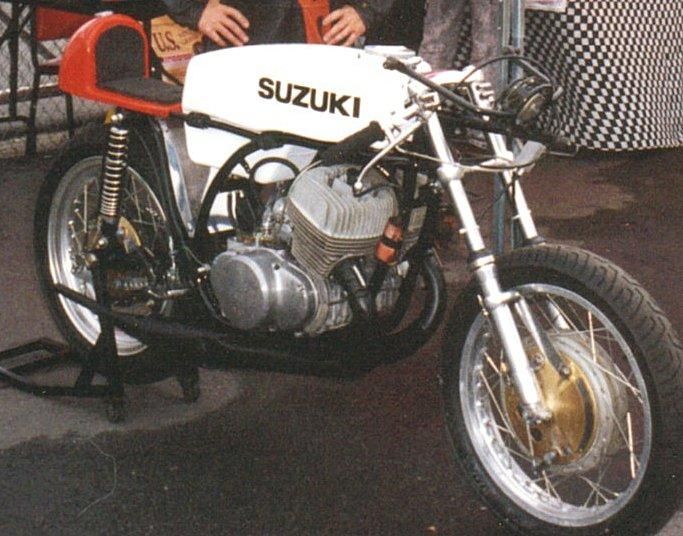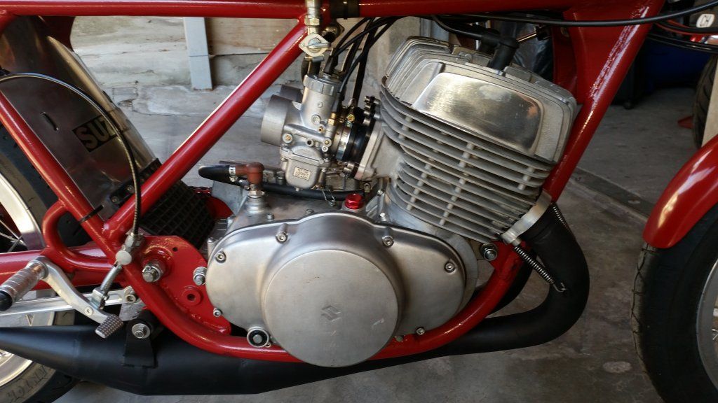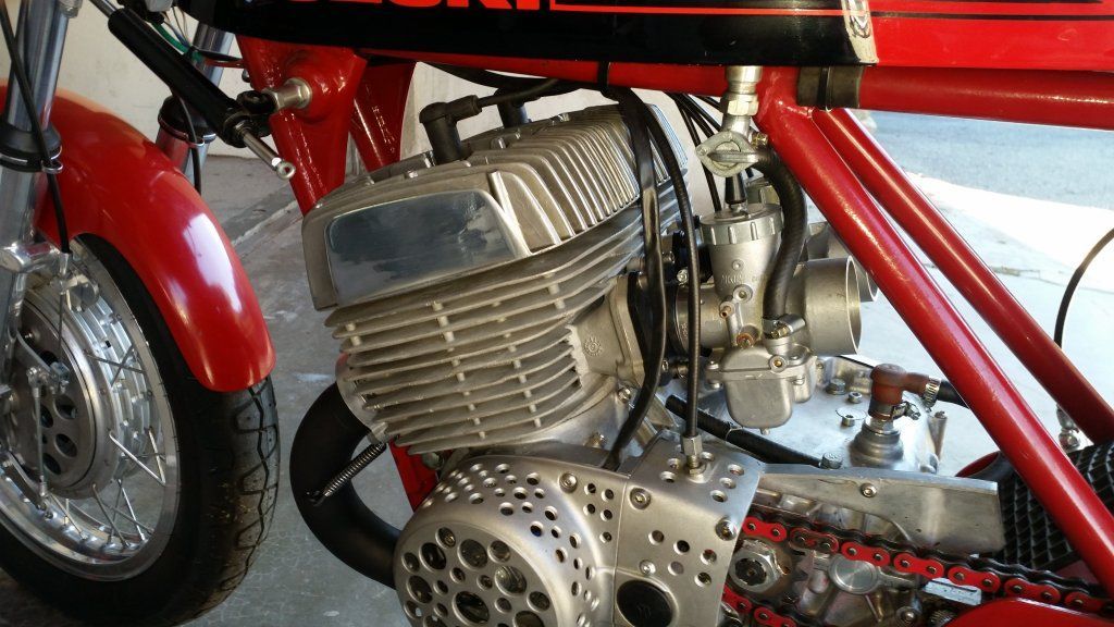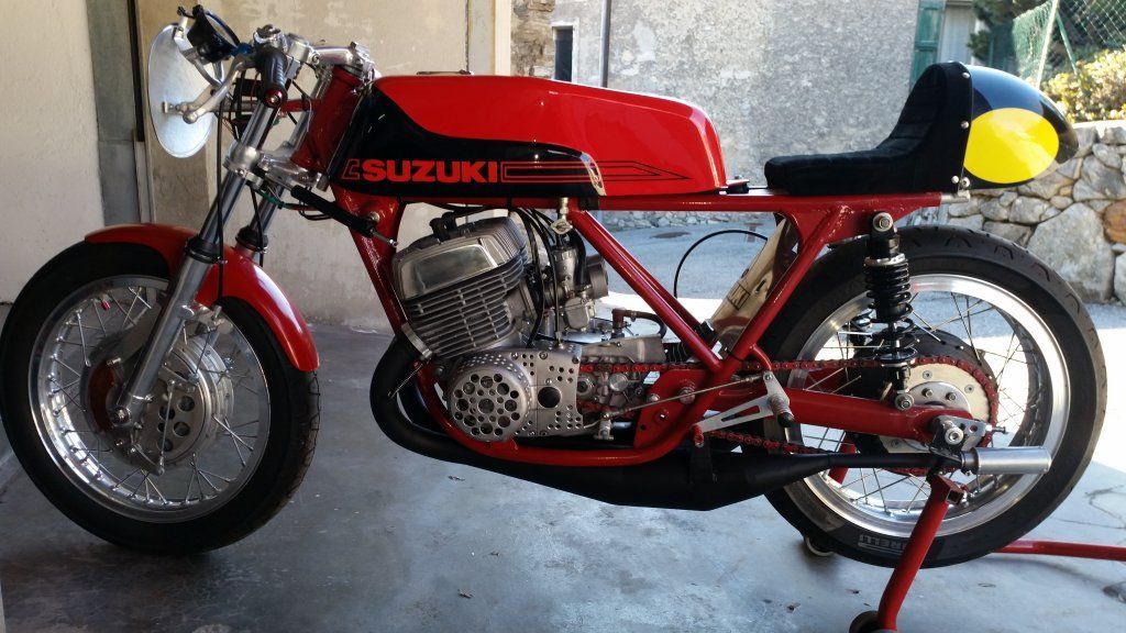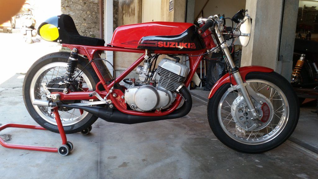 Suzuki TR500 replica. (non in vendita / not for sale) Cilindri lavorati con pacco lamellare + teste Daytona con candela centrale / Albero motore alleggerito / Ingranaggio primaria a denti diritti / Frizione racing / 2 carburatori Mikuni VM36 / Telaio rinforzato / Forcellone posteriore in tubi acciaio ovali / Freno posteriore originale Menani / Freno anteriore 4 ganasce Robinson / Forcella 35mm originale Ceriani. Potenza CV ca. 75 a 9000 giri.